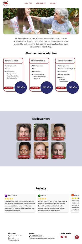 Ik heb een one sales page gemaakt om deze abonnementen te promoten. Het doel van deze pagina is om ouderen te overtuigen om zich aan te melden. Zo krijgen ze meer gezelschap en voelen ze zich minder eenzaam.